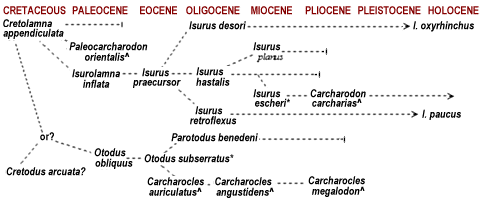 Note that Paleocarcharodon branches off early as does the lineage that leads to