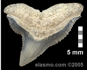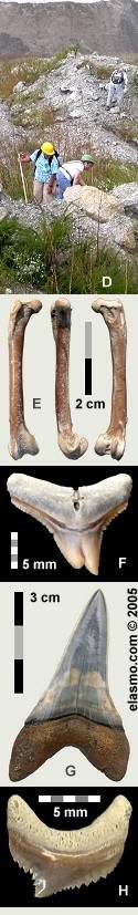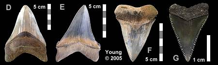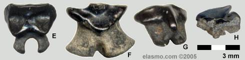 Several large lower Cosmopolitodus hastalis were seen, but Sharron Edwards' (2-1/4", image D) and Scott Lineberry's (2") narrow forms were particularly pretty. Duane Varnum located a Notorynchus symphyseal. Pathological teeth were reported by Howie Cohn (Notorynchus parasymphyseal) and Ed Horlick (Carcharhinus brachyurus, image F). Ed also found an Isurus retroflexus lateral. Large Galeocerdo cuvier teeth were abundant as were most species of smaller teeth. Six Carcharodon carcharias and one Squatina tooth were reported. Russell Willard and John Partin showed off Notorynchus lowers.