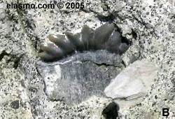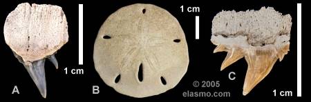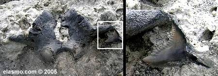 This late in the season, large megalodon teeth are not a realistic priority. On Saturday, only two megs were reported, each were 1-1/4 inch teeth. Yorktown collecting was best represented by David Fisher's great Cosmopolitodus hastalis (broad-form, aka xiphodon) upper A3 (1-3/4"); although Sally Labadie came away with an unusually large (1-inch) Notorynchus upper. The Pungo was heavily collected and produced a 7-1/2 inch section of a Squalodon jaw, containing one pre-molar, for David Thompson. Ron Edwards hauled out a mini-boulder containing a Notorynchus symphyseal tooth (image B). A fellow collector, Bill Hummel, produced a rock saw in the parking lot (don't we all carry one) and made a nice bookend for Ron. Whale teeth were shown by Tim Windler (2-1/4" Pungo sperm) and David Bright (3-1/2" Squalodon incisor). Echinorhinus blakei were collected by Candace Holliday, Sharron Edwards and Gregg Walden. Stan Hyne and Keith Robertson both found Squatina teeth. George Powell wandered to the Croatan Fm. and found associated crab claws of Menippe mercenaria (Stone crab). Other fossils were the usual assortment of hemis, contortus, Notorynchus and the ever abundant carcharhinid teeth.