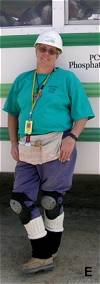 Although she'll be back for the Spring season, the presence of one collector was sorely missed this Fall. For more than 20 years, the name of Becky Hyne has been synonymous with the Lee Creek experience. Her nickname, Our Lady of the Yorktown, tells it all. No person has ever taken so much time to train fossil novices in the art of Lee Creek collecting. Nor has anyone has ever been so generous in sharing their own fossils; for many of us, our first big whale tooth or 'meg' came from Becky. She then took time to train us in our own quest for fossils at Aurora. Before information on Lee Creek fossils was widely available, Becky was the one to whom we always turned for help with identification. We still depend on her assistance with our marine mammal fossils. Her success with the Pungo crawl technique has inspired a new generation of collectors to seek the small and unusual. This season, we've all missed seeing Becky. Recovering nicely from leg surgery, there is no truth in the rumor that it was caused by the Pungo Crawl.