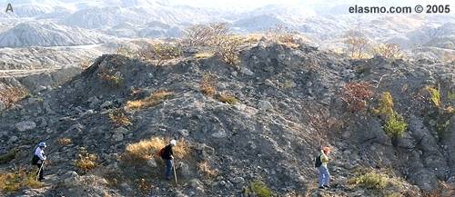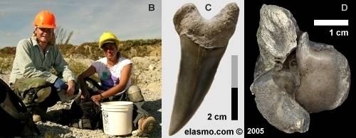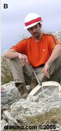 Not everyone comes to Lee Creek in search of fossils. Duke University graduate student Russell Powell (image B) and his assistant, Victoria Campbell, came armed with insect nets in search of grasshoppers. They were extremely successful in their quest, gathering both male and female specimens. Several fossilers donated specimens as well. (Image D, which shows an American Grasshopper, Schistocerca americana, perched on the shoulder of a Lee Creek collector, is an elasmo.com file image.)