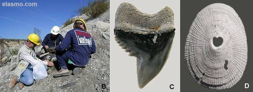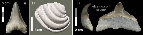 The remaining 30 Friends of the Museum cashed in their rainchecks for a trip on Sunday. Led by Candace Holliday (image E), this enthusiastic group quickly departed for what was hoped to be previously overlooked tooth territory. Knowing Saturday's group had probably scoured the area, the crowd used a hit and run technique - if it was there, pick it up. If not, quickly move to another area and look closely. Several very nice C. hastalis (broad-form) were collected, with Marlyn Allen's upper being the largest (2-1/4"). Jimmy Holton and Eric Seigle found lowers in the 2-inch range. Heather Greer got a great 3" lateral Pungo meg. What Bruce Worf's meg missed in detail was made up in size a 5-1/2" Pungo re-worked specimen. The Pungo limestone produced a decent 2-1/4" lateral C. chubutensis for Matt Seidel. Jerry Ryan and George Greer found sperm whale teeth. Xan Dubrock brought out a pathological lower Notorynchus and Amy Turner a neat (1") Galeocerdo cuvier (image C) tooth. A surprisng interest is being shown in smaller teeth these days. I saw Rhizoprionodon (Keith Robertson and Candace) and a Paragaleus (Sharron Edwards) teeth. Invert material was best represented by Richard Havens nice specimen of Diodora nucula (keyhole limpet, image D) and Stan Griggs two complete sand dollars (Mellita).